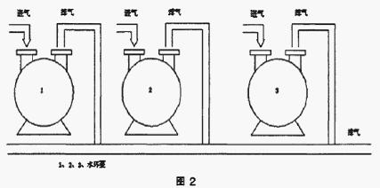 第二,多臺水環泵不采用排氣管道串并聯使用(如圖2),我公司目前多處使用該連接方式,而是采用單臺泵單用排氣管。